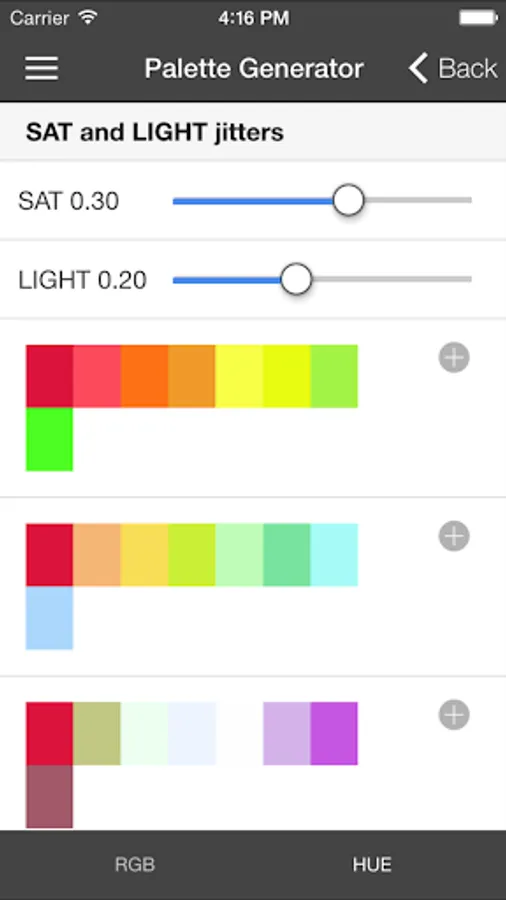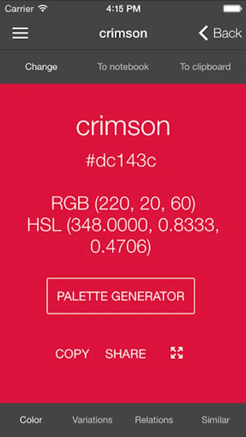 While browsing and exploring colors, you can save shades to named palettes or to a generic notebook and access them later.