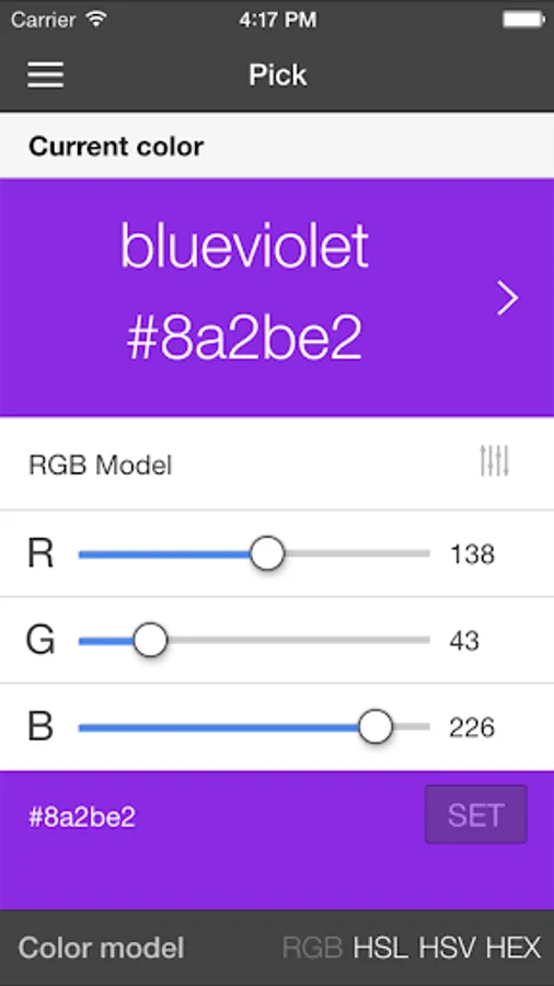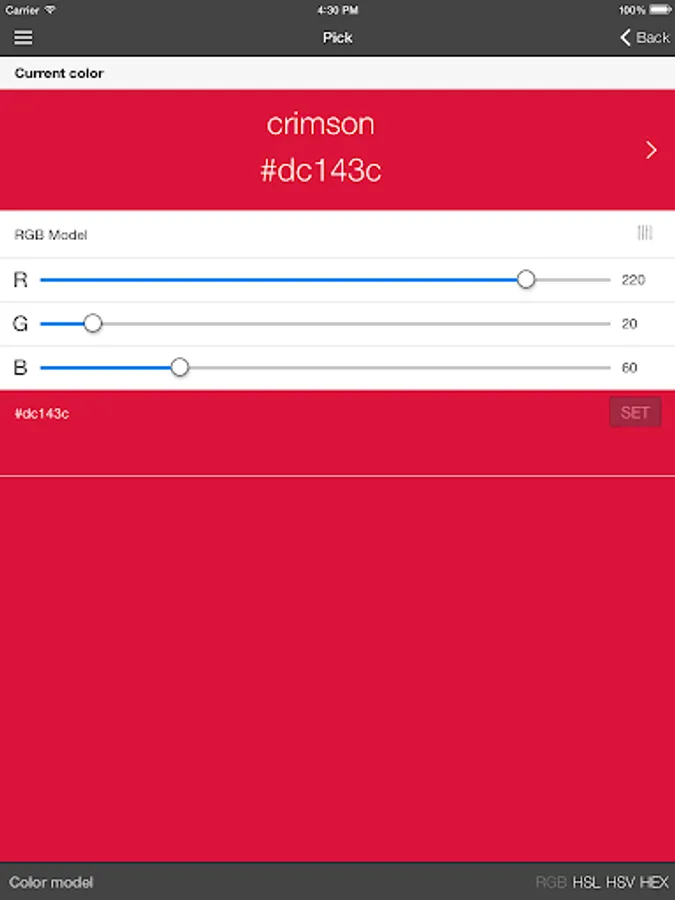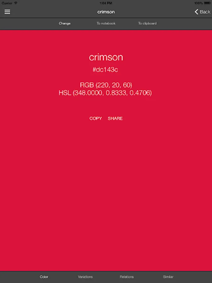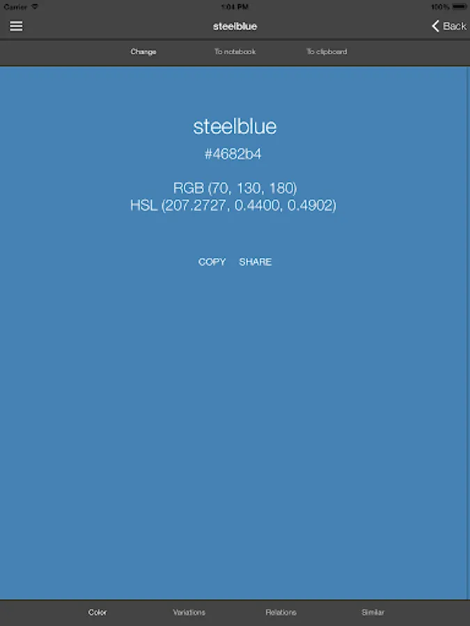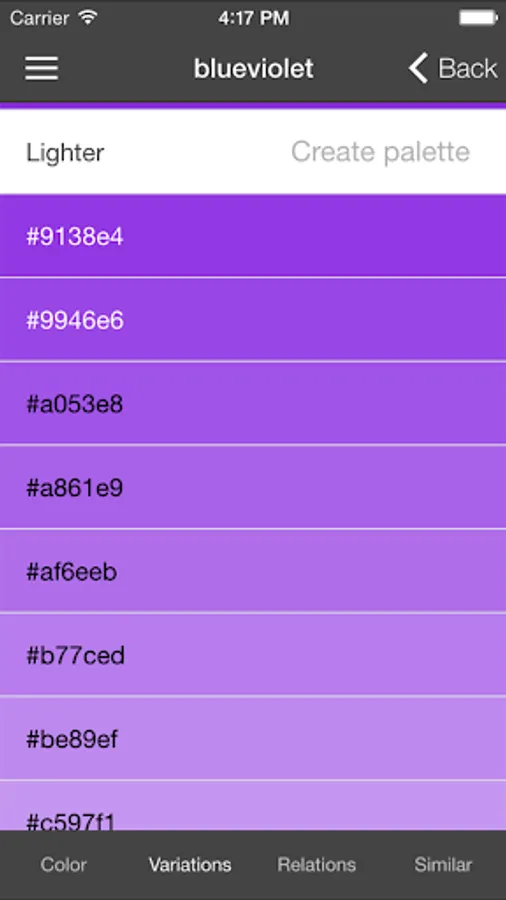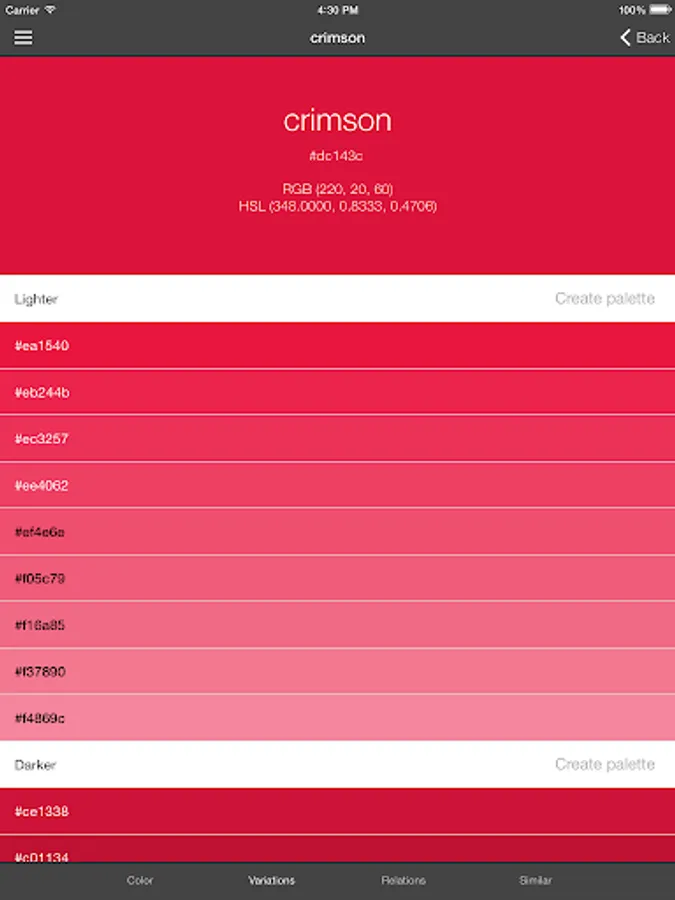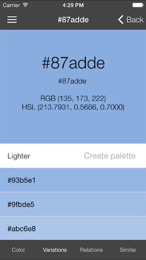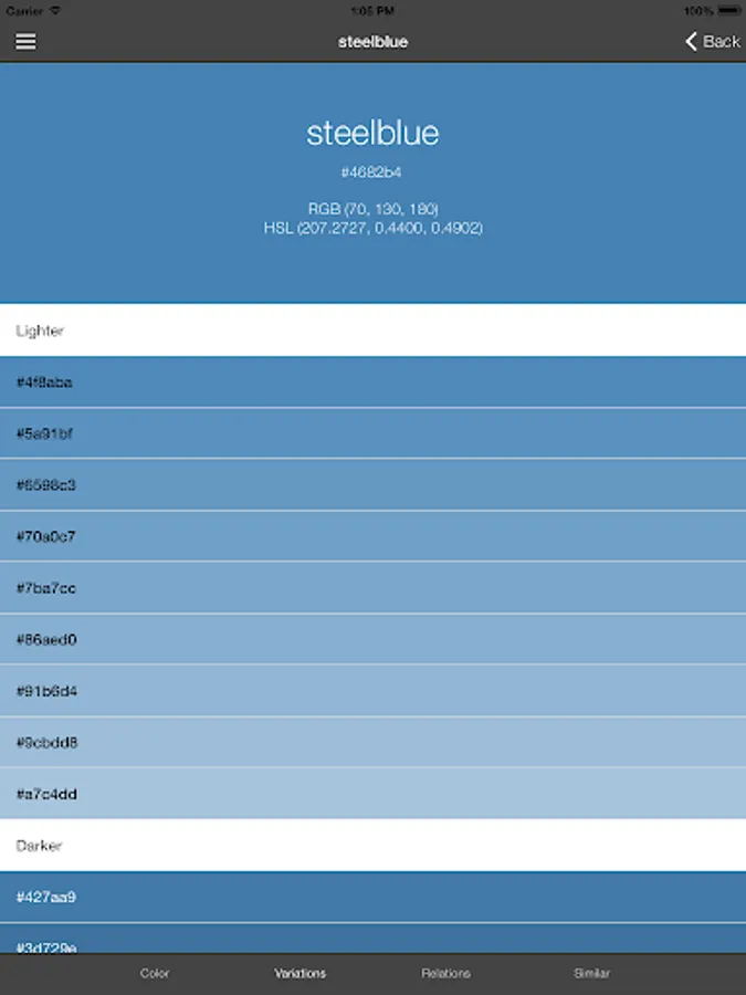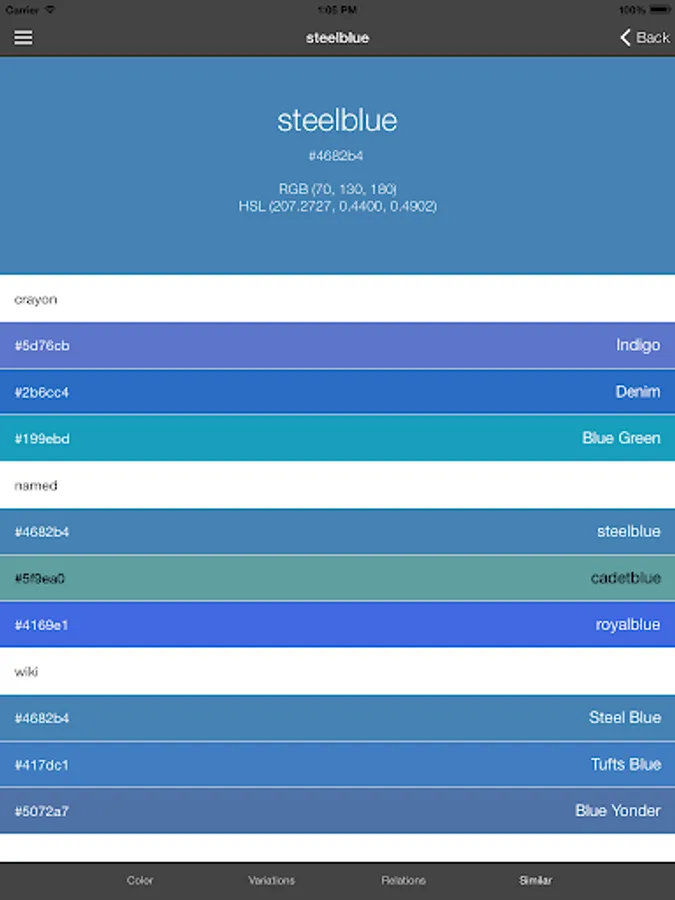 Similar colors show the three closer shades in the various color lists featured by the app.