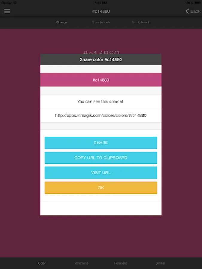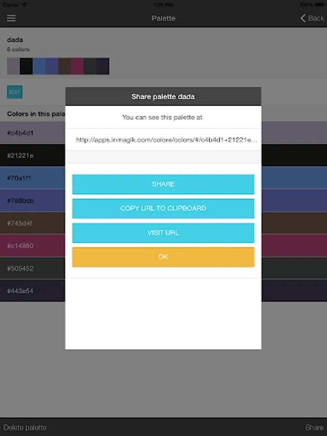 Once you have discovered interesting shades of color and palettes, you can easily share them with a simple link, which you can copy or send by email directly from Colore.