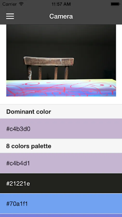 If you need more inspiration from the real world or from existing designs, use the grab from picture feature to extract the dominant color and an 8 colors palette from an image stored in your device or coming directly from the camera. You can also grab an image from an URL on the net.
