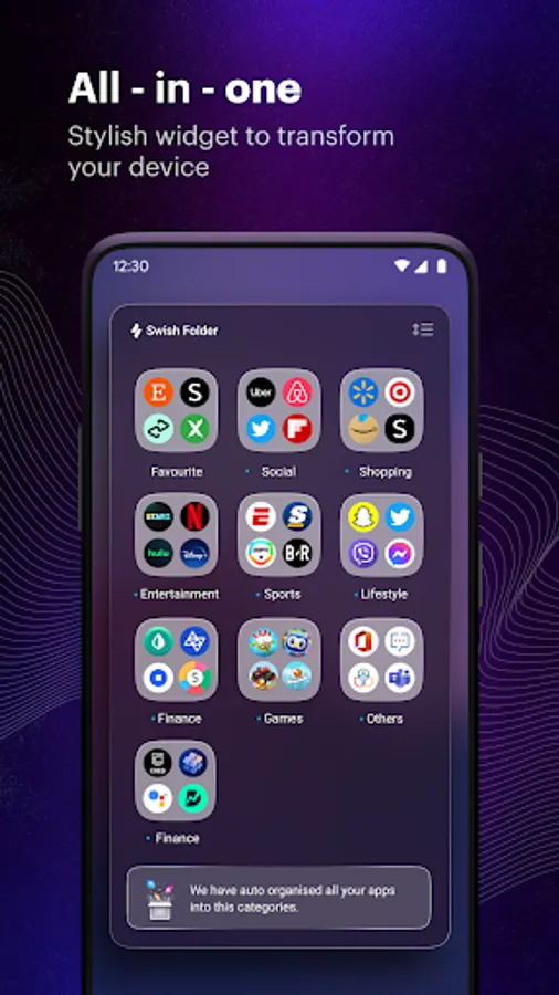 The Folder Wall organizes all your installed apps into a single, easy-to-navigate location. It can be used as an app and placed in your app dock on the home screen for easy access. It can also be placed as a full-screen widget on your +1 or +2 home screen.