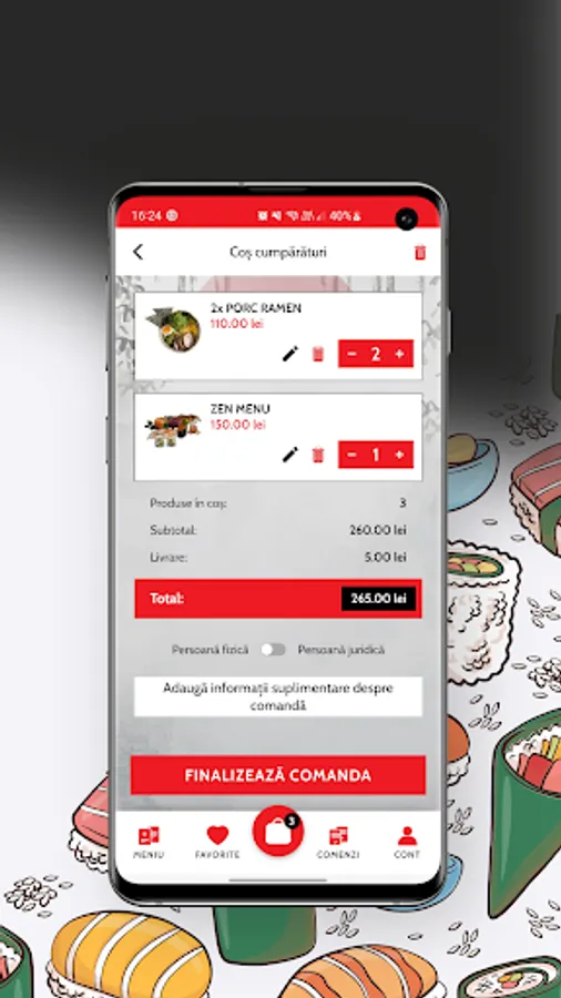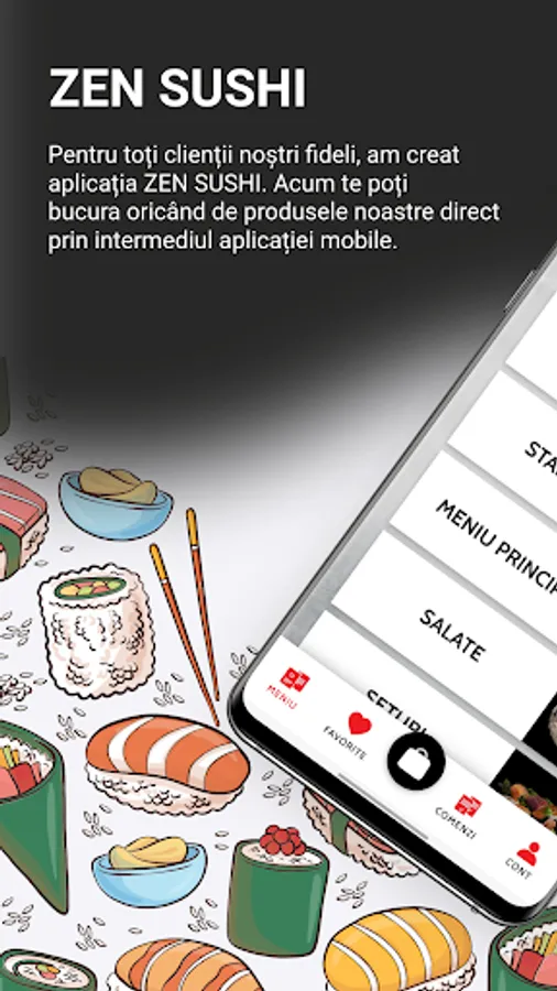 ZEN SUSHI has prepared for you, our dearest customers, a mobile application! Through our app, we offer you the possibility to easily place an order, pay through the app and select from our multiple delivery options. Also, through the application you will be the first to know about the latest offers, products or promotions. Download the app and let us reward your loyalty with our in-app offers.