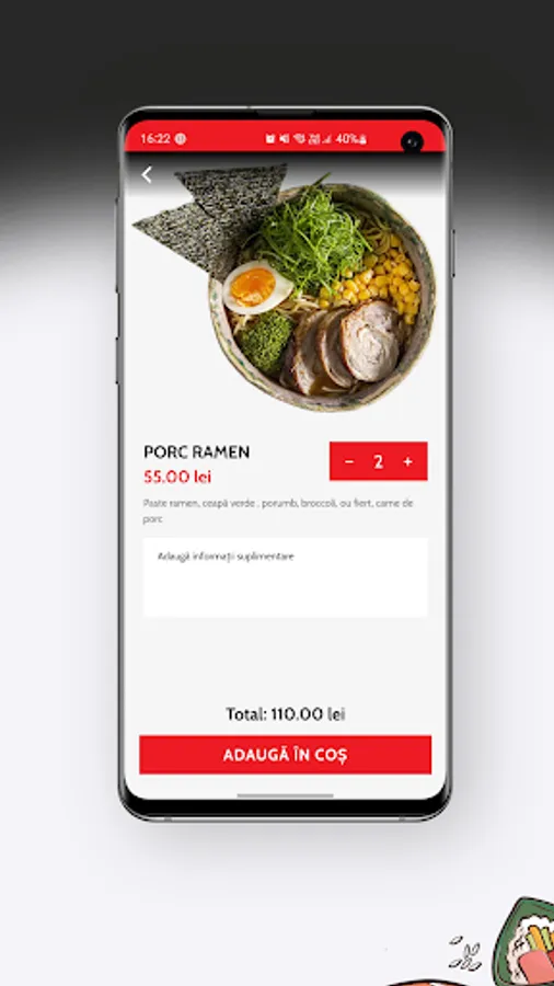 Create an account with an email address, enter the application and have direct access to our menu. Choose one of our delivery methods, add your favorite products to the cart, choose the payment method and complete the order.