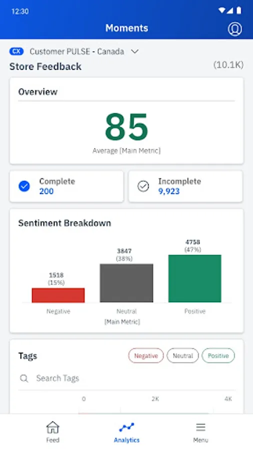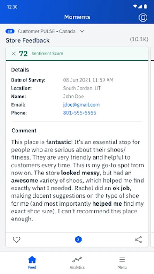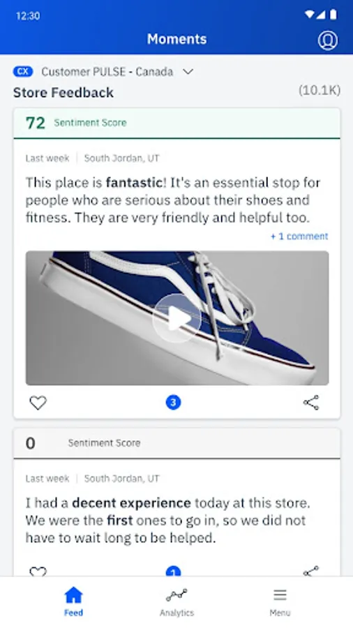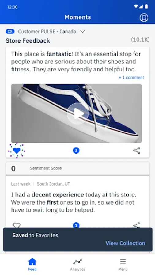 Users can drill down by account or program and quickly access saved views and collections of customer feedback spanning multiple data sources. The application transforms simple metrics into meaningful data and offers insights into feedback sentiment, and keywords and topics customers are talking about most. With Moments mobile, users get the insight they need to take action on-the-go.
