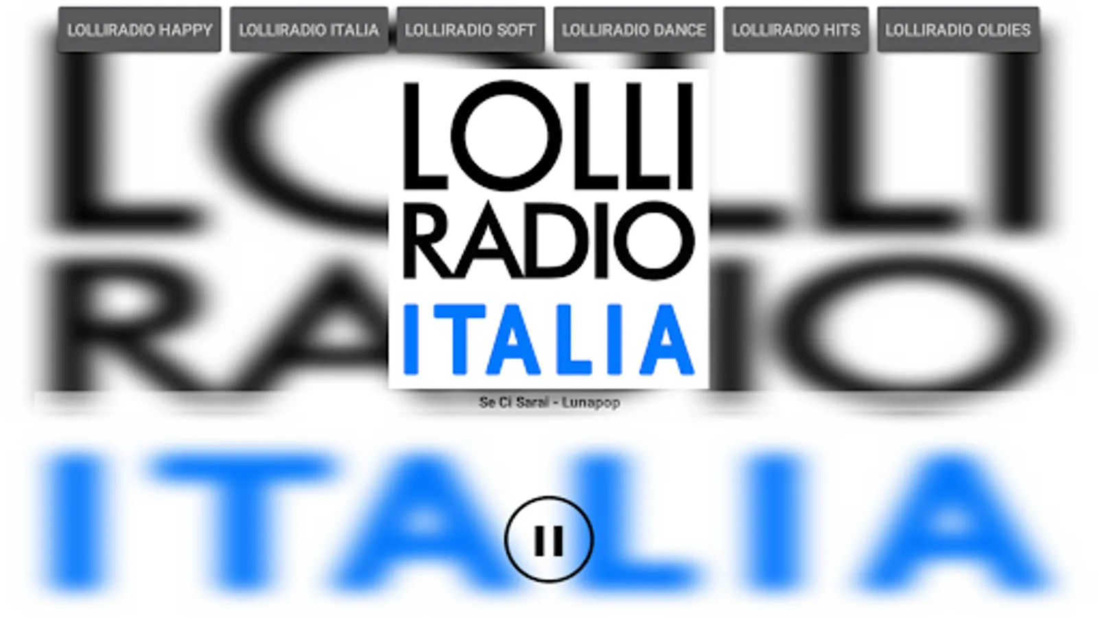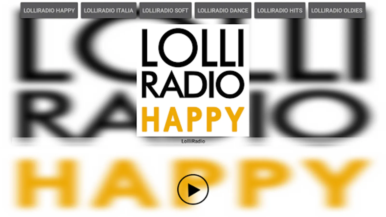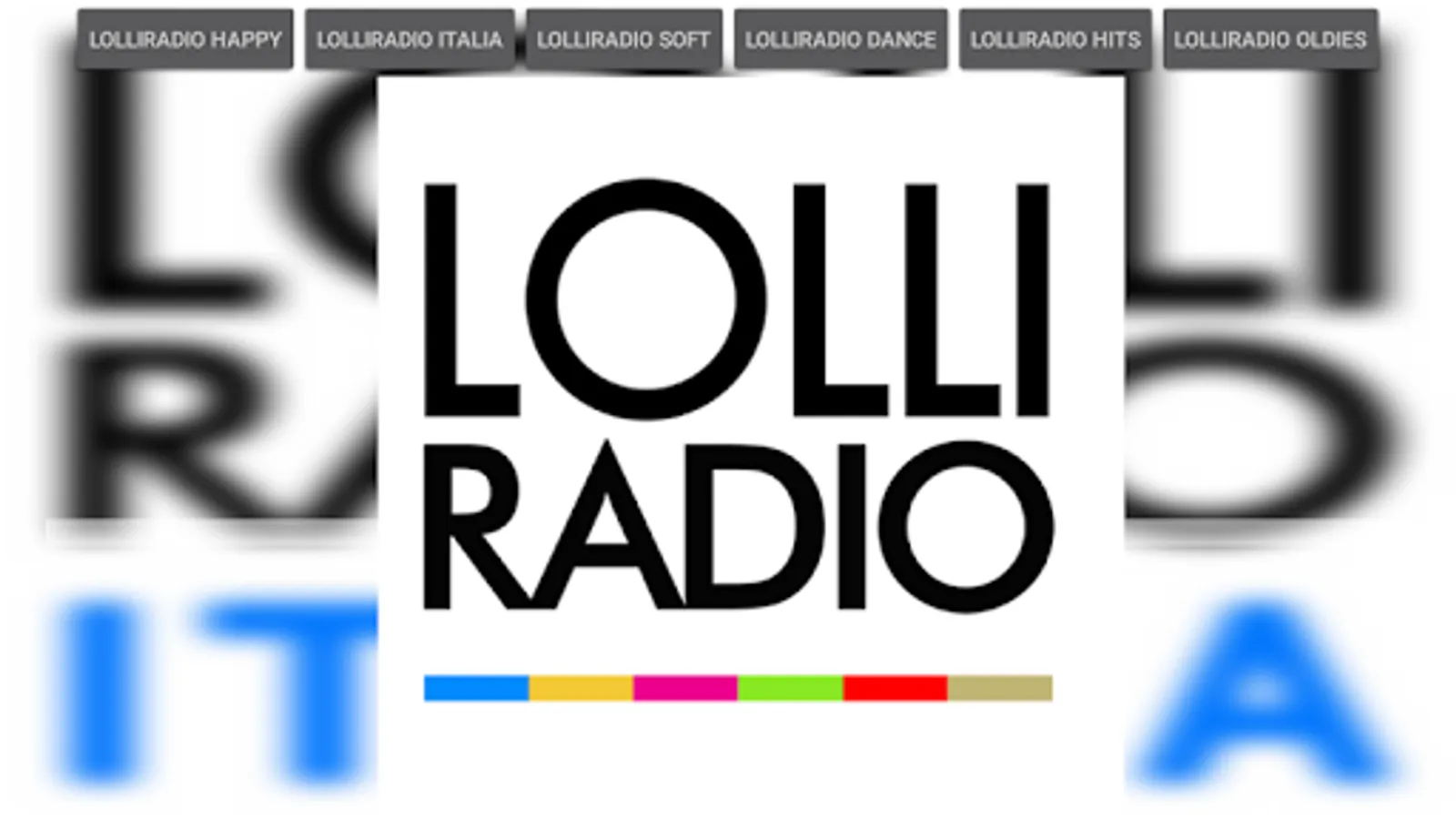 Listen to the six channels of LOLLIRADIO NETWORK. Lolliradio Happy Station is the first Italian radio of only happy music: only joy, no sadness! Lolliradio Italia is just Italian songs. The great classics of the best artists in their original versions: only Italian songs but only the beautiful ones! Lolliradio Soft is the lovely-radio that comes from the heart: every song is a great emotion! Lolliradio Dance plays all the strongest dance, house and pop-remix hits in Italy: but the music changes every 3 minutes! Lolliradio Oldies is the best music of the '70s and' 90s: the encyclopedia of great pop music. Lolliradio Hits is a continuous rotation of the 100 greatest hits of the moment in the Italian charts and radios. LOLLIRADIO NETWORK: six radios, one big passion for music!