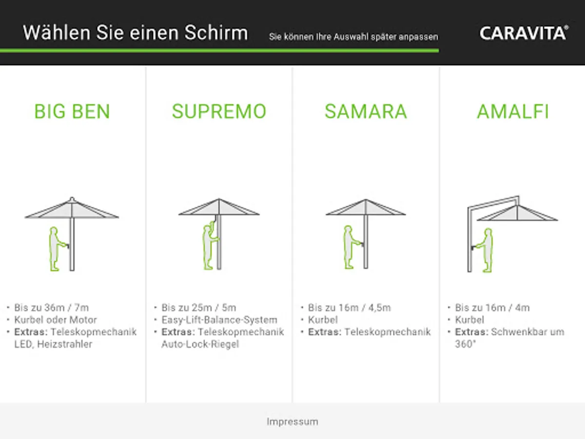 The CARAVITA AR Designer is your configurator for the virtual planning of your parasol. Using the Augmented Reality App, BIG BEN and Co. can be easily configured and visualised at your personal at your personal place of use.