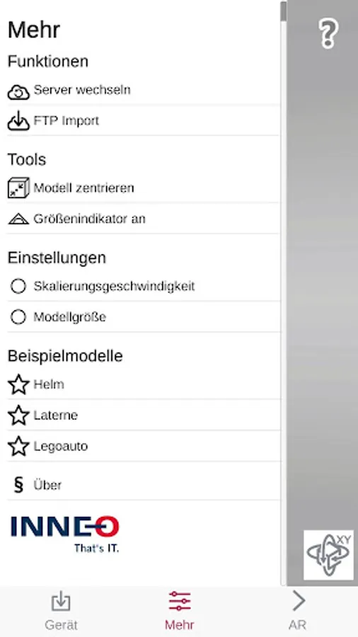 It enables you to import GLB models from cloud services like Google Cloud or OneDrive directly with the app. Models, which are hostet Online with NeoSpace Webviewer can be opened in the app via QR codes. From inside the app you may navigate through your data system and import the model files as well. With this method you also can open ISPF (INNEO Script Parameter Files) to create explosion views for your imported models. The explosion views require the model to consist of multiple parts to work properly.