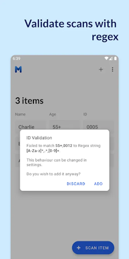 Ensure that you always get the right data by optionally using a regex validation string. If the validation fails, you can choose whether to add it or not.