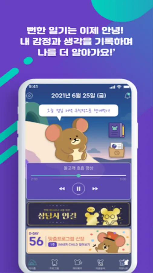 2) 사용자 = 어른이👫 의 심리 문제 유형에 맞는 "생각", "행동", "명상" 3가지 생활 밀착형 미션을 해결하면, 나도 몰랐던 나를 발견할 수 있어요.