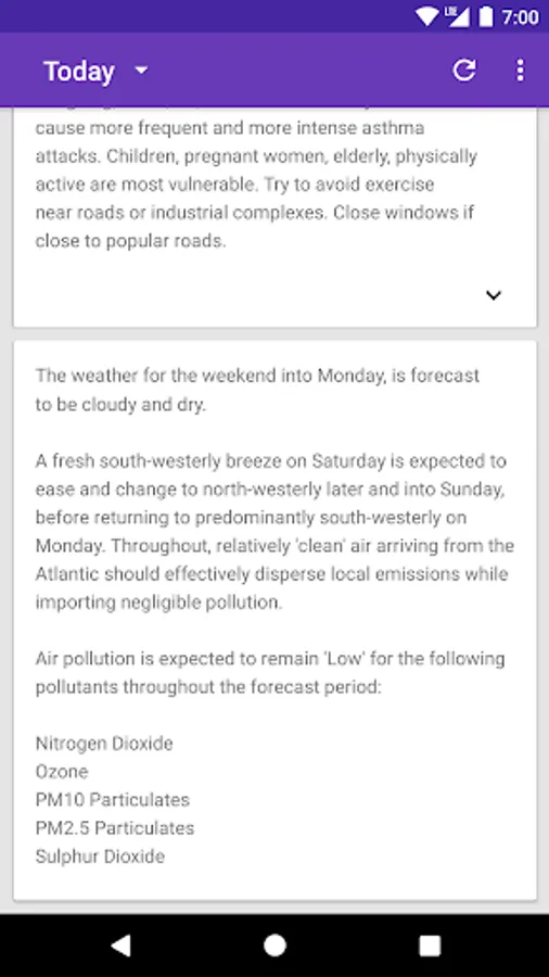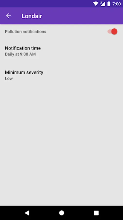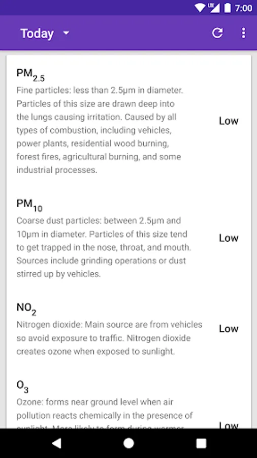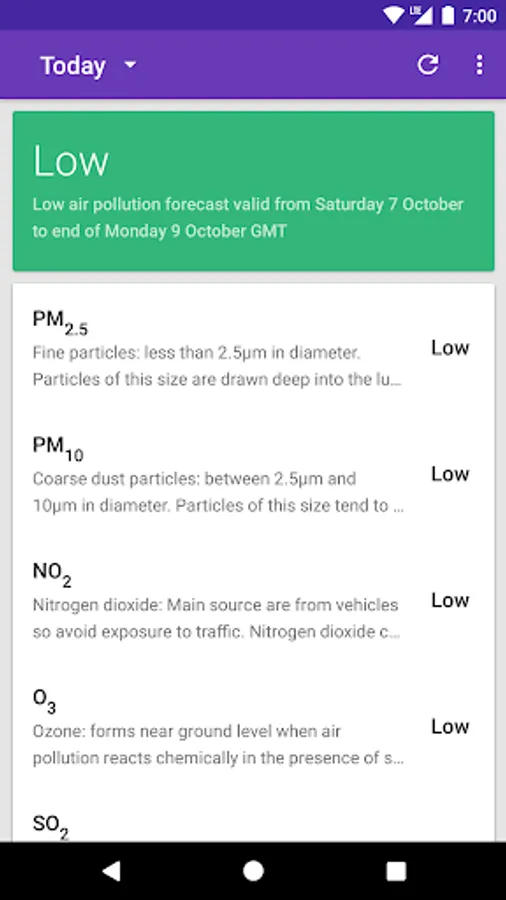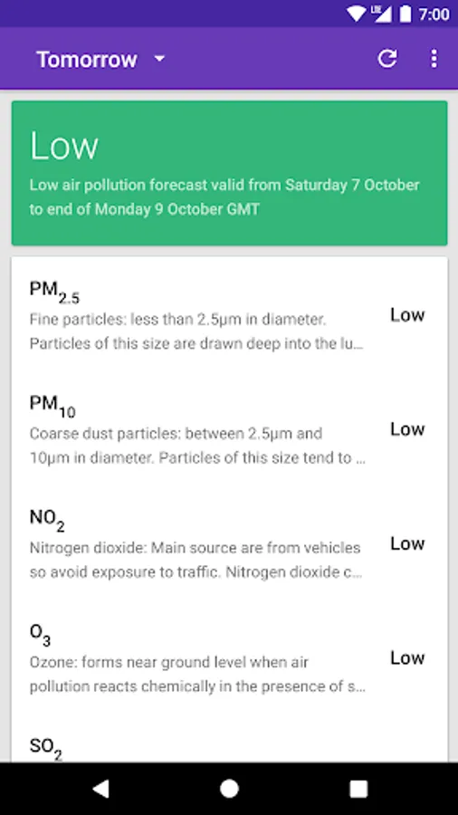 Get a detailed breakdown of current and upcoming, individual pollutants and their effects on your health in London. Receive configurable daily notifications when the pollution level crosses a threshold. Provides a detailed analysis of the source of the current pollutants in London, using the TFL Air Quality API.