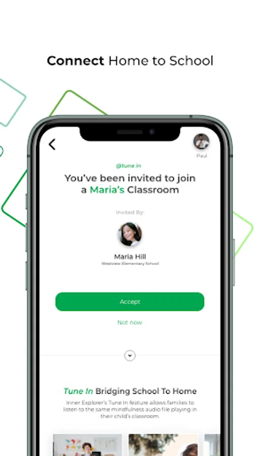 With Inner Explorer's Home App, you and your family can enjoy peaceful sleep, lower anxiety, improved emotional regulation, better focus, and increased empathy and compassion. Our exclusive "Tune In" feature allows parents to stay connected and informed on how mindfulness is practiced in their child's classroom, so you can support your child's practice at home.