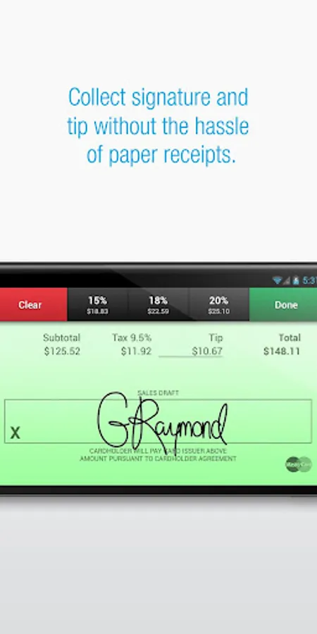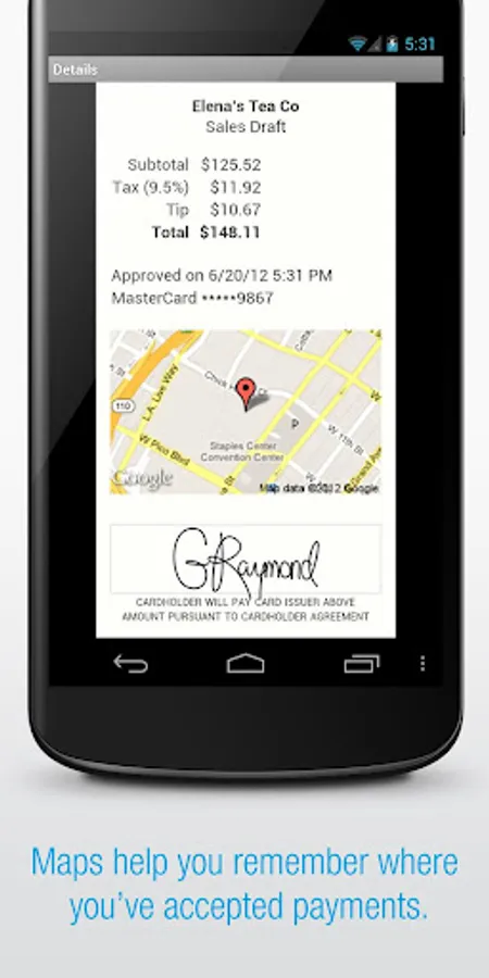 With Credit Card Terminal, you can swipe or key in credit cards, accept tips, capture signatures, collect sales tax, and print receipts. Even send PDF receipts with a map showing the transaction location.