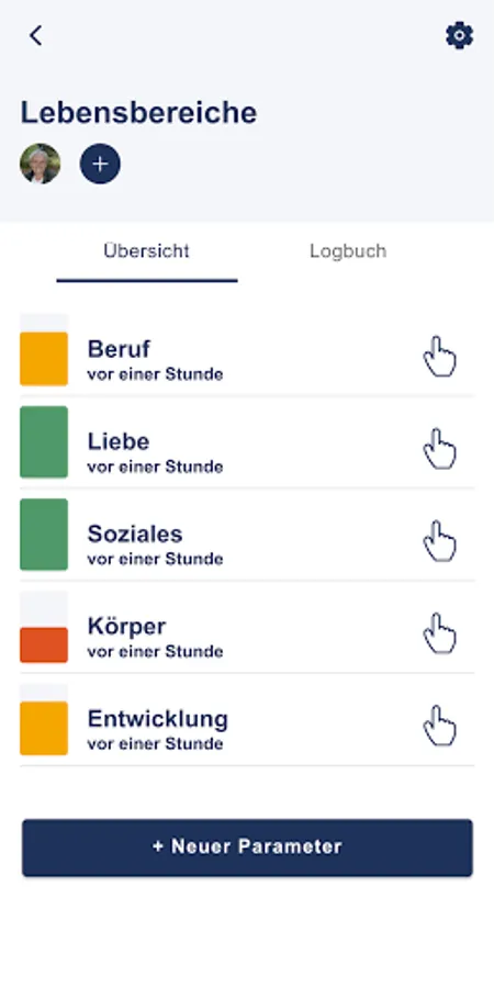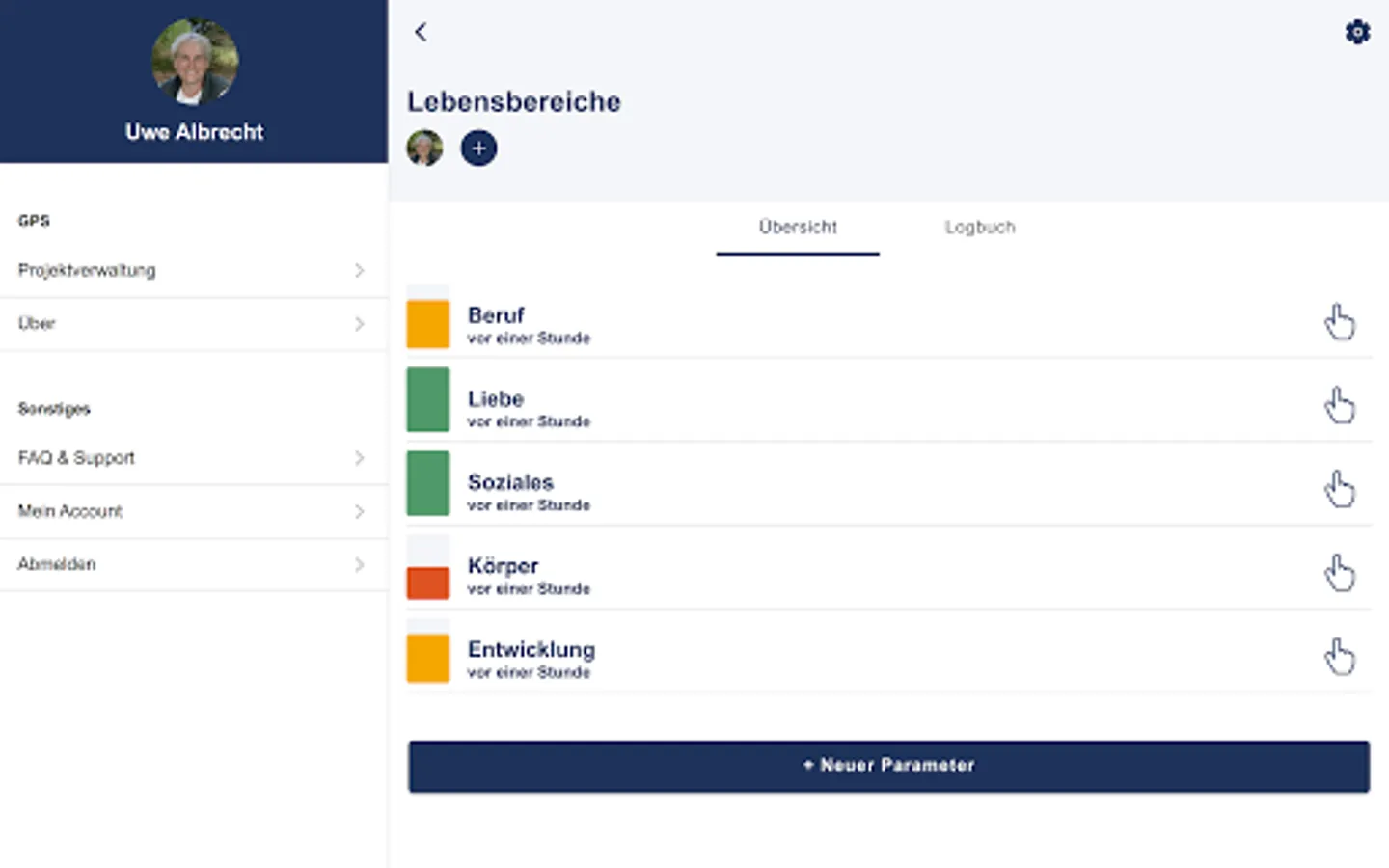 The app helps you live happier and more fulfilled. For this you can, for example, create the project "LIFE AREAS" and then create the following parameters below it: