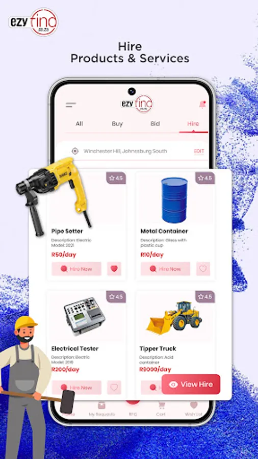 Hire Builders, Plumbers, Electricians, Artisans, Engineers as well as heavy machinery and equipment.