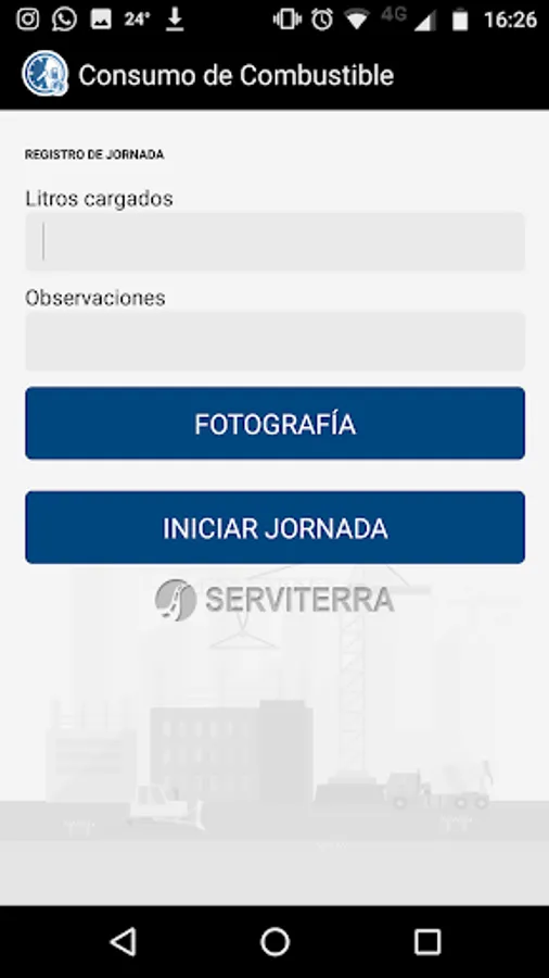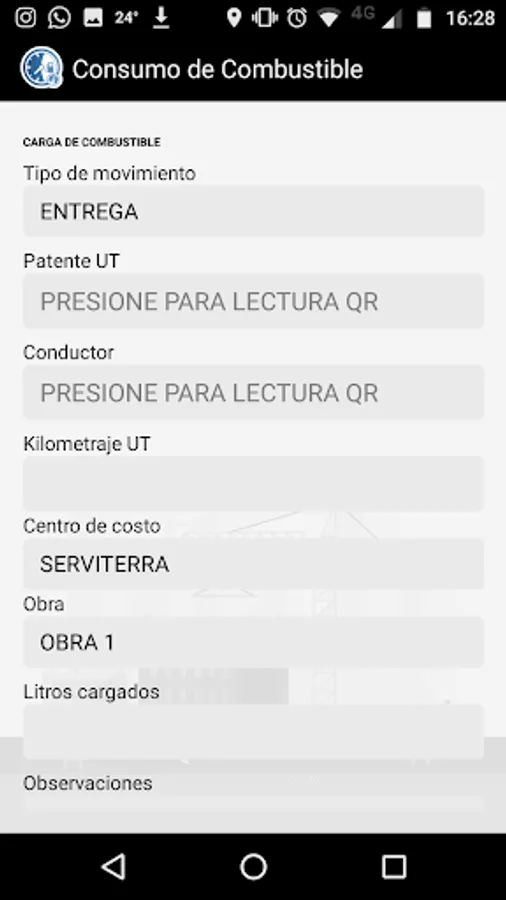 The operator enters the requested information when generating a fuel supply or delivery trucks and machinery of the company Serviterra.