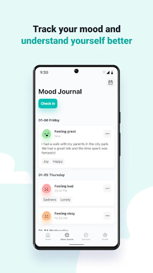 Shed light on the complexity of your emotions by tracking your mood, exploring your emotional well-being, and journaling about your experiences. Daily mood tracking will help you notice emotional triggers and behavioral patterns, and you’ll begin to feel more in control of your feelings.
