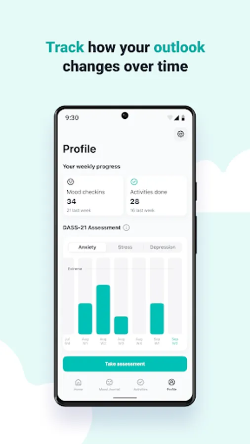 Get data about your well-being directly in your mental health app with the DASS-21 assessment. Measure your feelings of anxiety, stress, and depression every week, see your progress, and set new mental health goals.