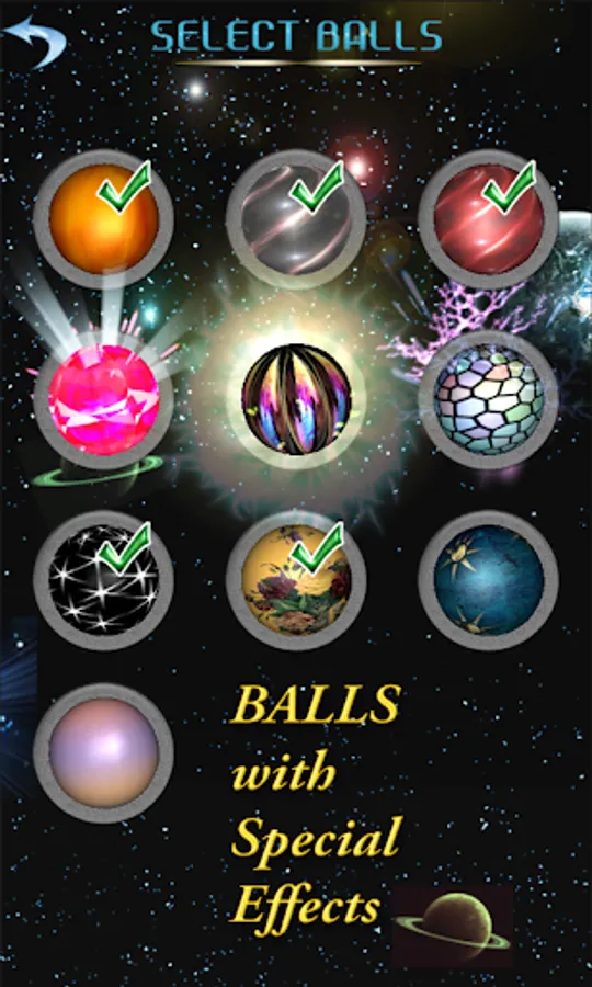 - 10 custom balls with special effects. Player can select up to 10 balls, each ball for each throw.