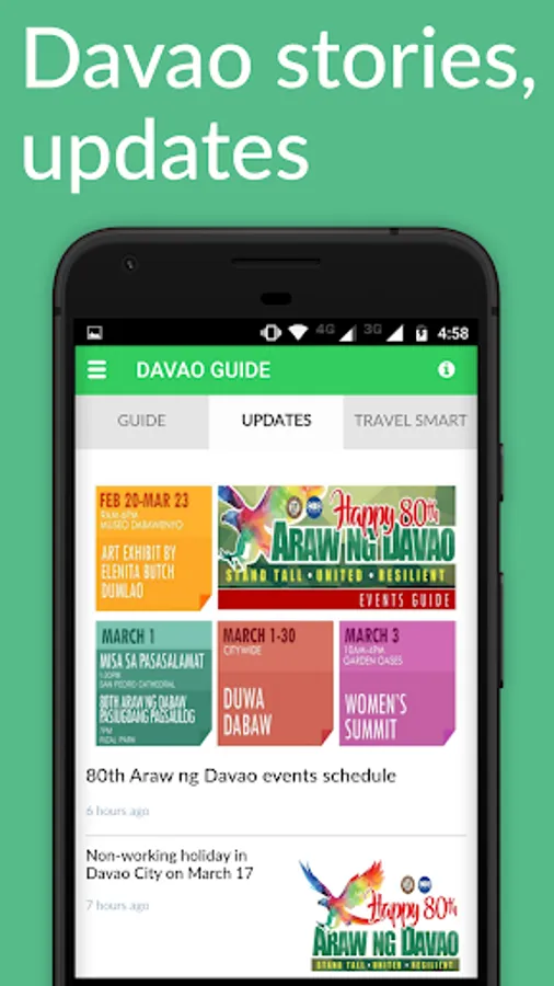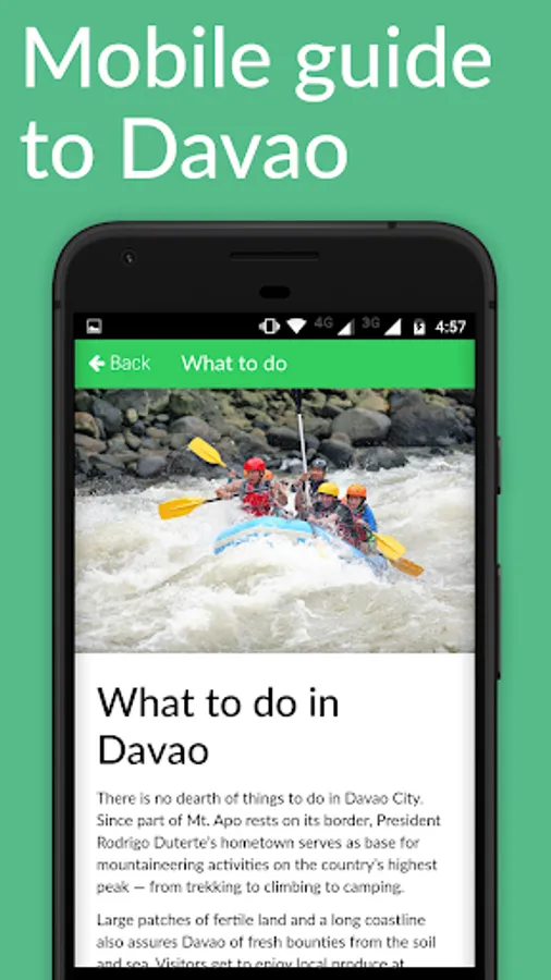Davao Guide is your portable guide to Davao. It lists places to visit, things to do, and food to try. It also offers a listing of places to stay for your Davao visit.