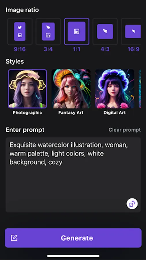 Tạo nhanh chóng bức ảnh AI riêng của bạn với công nghệ AI tiên tiến của chúng tôi. Khám phá một loạt phong cách nghệ thuật và tỷ lệ hình ảnh để tạo ra một bức ảnh thật sự phản ánh phong cách độc đáo của bạn.