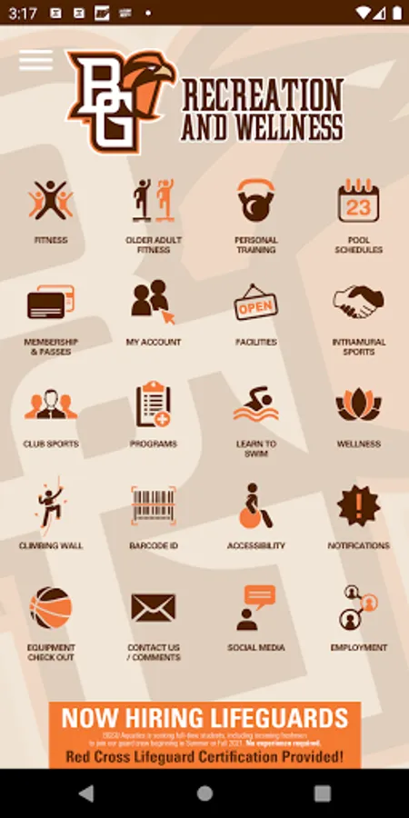Programs include Aquatics (certification courses, learn to swim), Falcon Fitness (group exercise, small group training, #Move4YourMood, assessments and services, older adult fitness, personal training), Intramural Sports, Outdoor Program (trips, climbing wall, wilderness first responder training, team building), Club Sports, Health Enhancement Programs, Wellness Connection (late night events, peer education, programs and presentation on stress, self-care, nutrition, alcohol, tobacco, drugs, personal and campus safety, sexual health, sexual violence prevention, bystander intervention, fitness, body image), Youth and Family (kids camp, birthday parties), and Partnership Initiatives (BGSU Cares, Its On Us, Safe Communities of Wood County). Featured facilities are the Student Recreation Center, Perry Field House and outdoor recreation spaces.