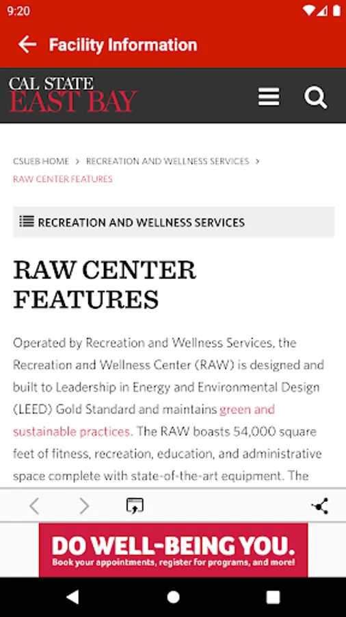 The Department of Recreation and Wellness Services complements the academic mission of California State University, East Bay by enriching the student experience with a commitment to service and social engagement. We are dedicated to providing quality programs and facilities that are integral to the success of the campus community.