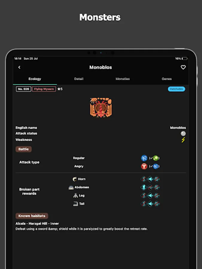 You can check all the game information including monsties, genes, monsters, weapons armors etc.