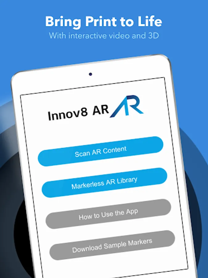 Download the Innov8AR app and scan the augmented reality enabled markers to experience interactive video or 3D content.