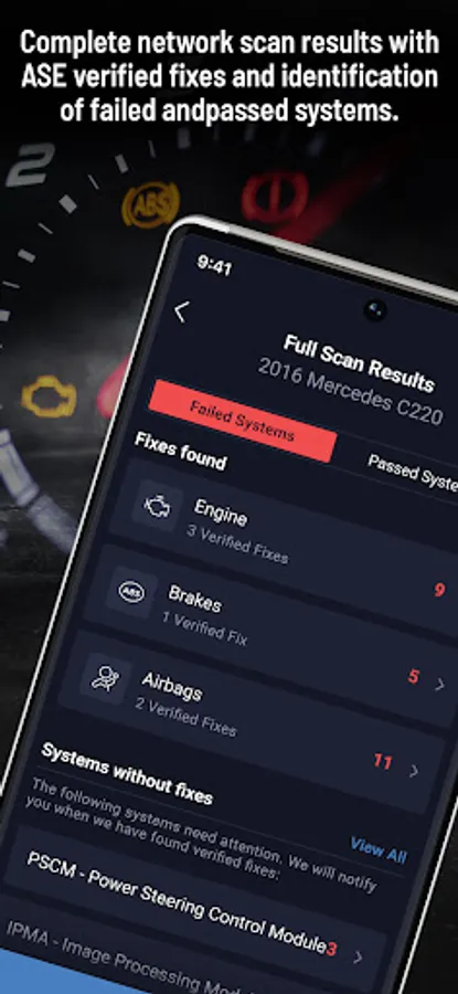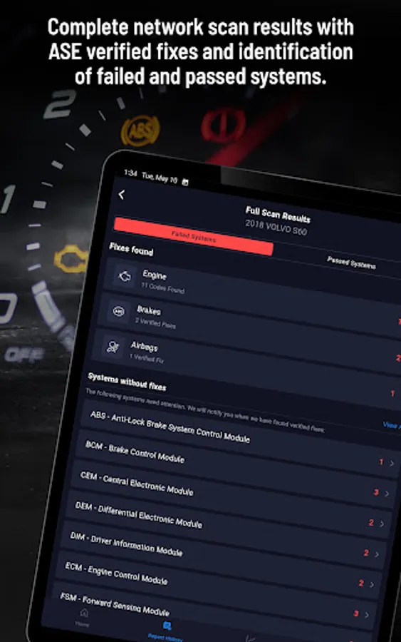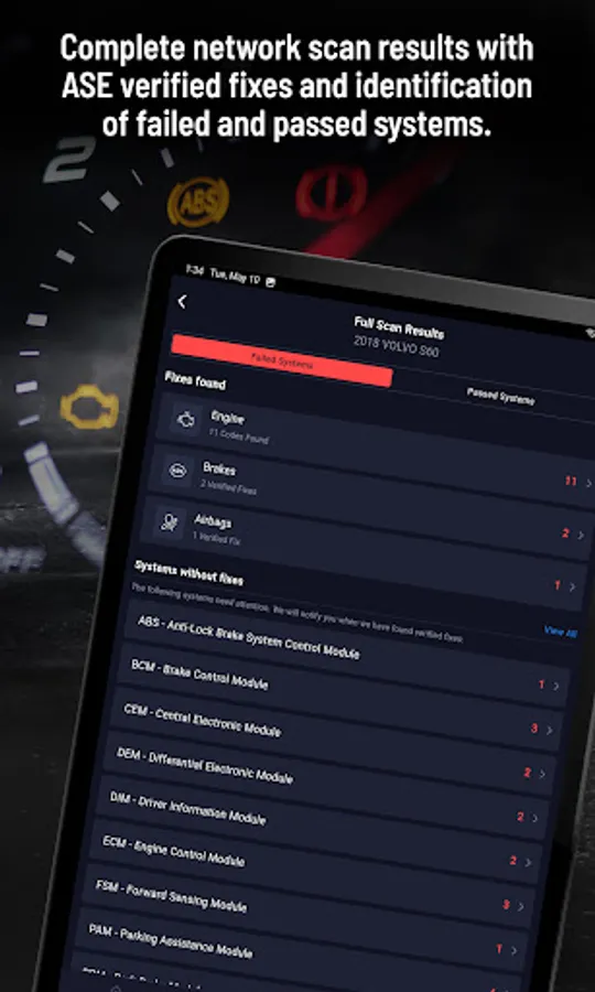 - Complete Vehicle Scan - Perform quick scans (engine only), specific modules, and complete network scan.