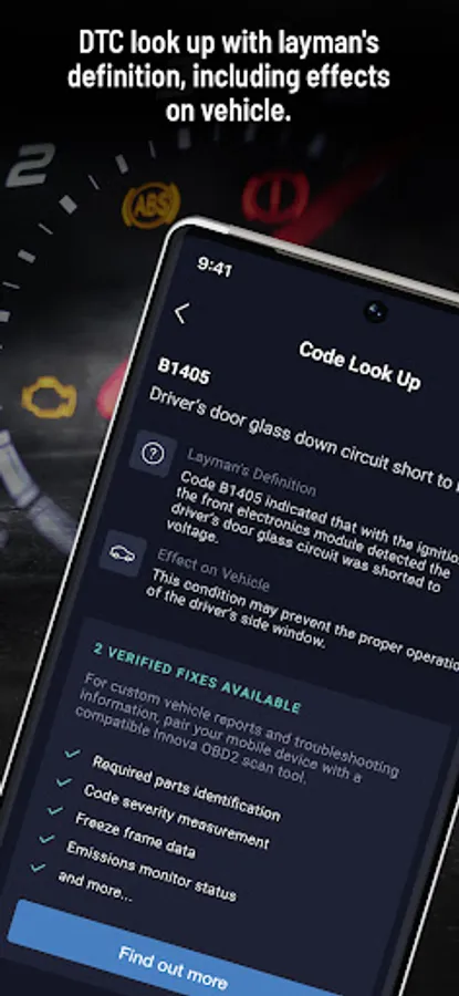 - Lookup DTC Code Definitions – Access to specific, layman’s, effect on vehicle, all paired with ASE-verified fixes at your fingertips.