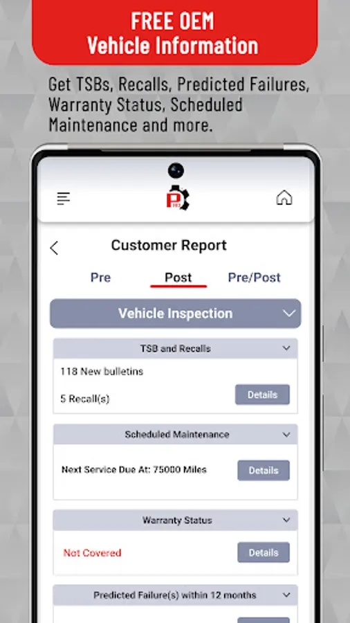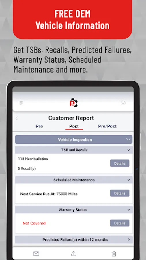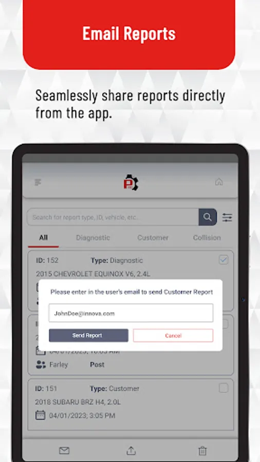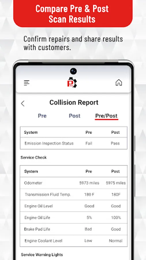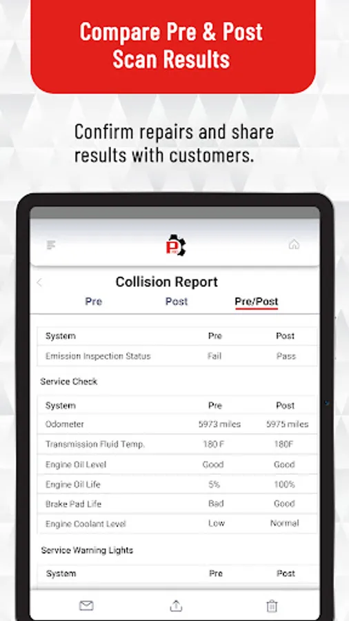 Once the report is in the app, you can generate Pre and Post Scan reports for each vehicle and share results with customers.