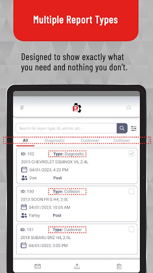 You can view four different types of reports (Diagnostic, Customer, Collision, and OBD2) submitted from your SDS tablet. We designed each report type to show exactly what you need and nothing you don't.