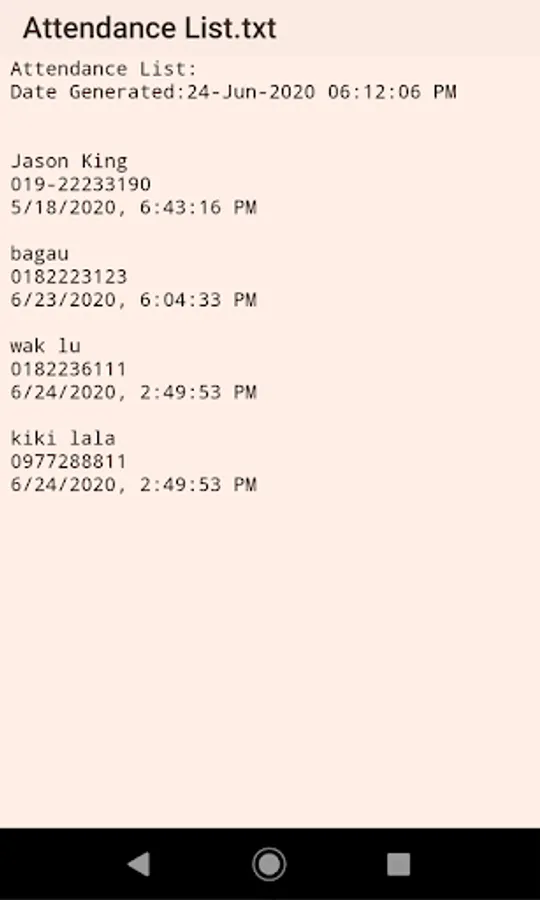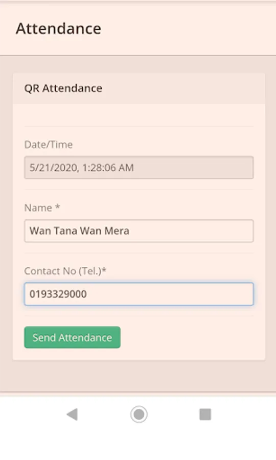 When a visitor scans the QR Code Attendance with a mobile phone, it will open up an attendance form for them to fill up (name, phone number and date/time) and send it online.