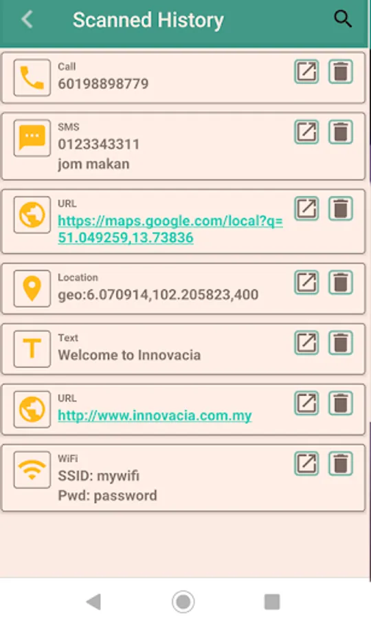 To retrieve the QR code information in the future, you can open up from the Biz Card Listing or History Listing. From the listing, you can manage to delete or open the information.
