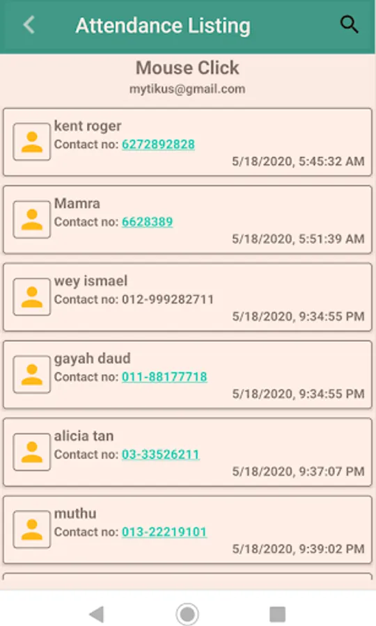 The business or office owner (QR Code Attendance Creator) can view their visitor attendance list from the app. Use the Search function to filter by date.