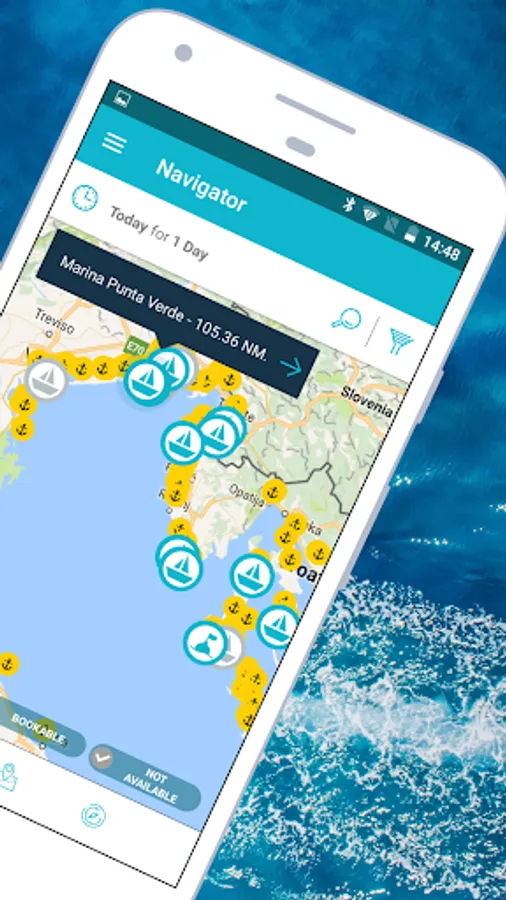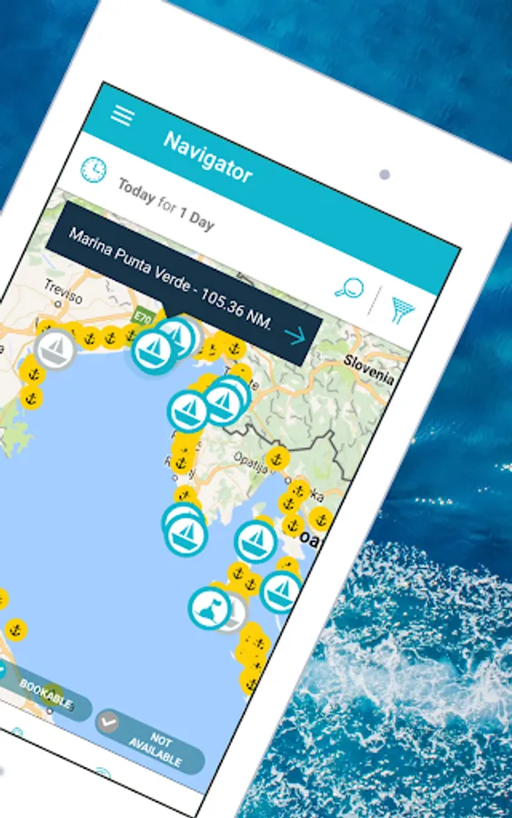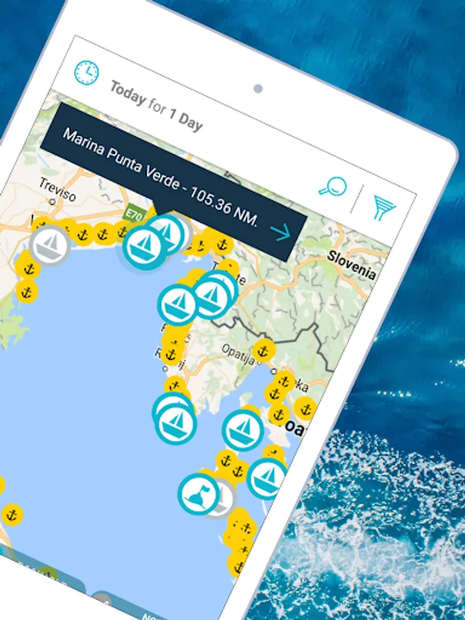 -> State-of-the-art map view displays marinas in the surrounding area of your location