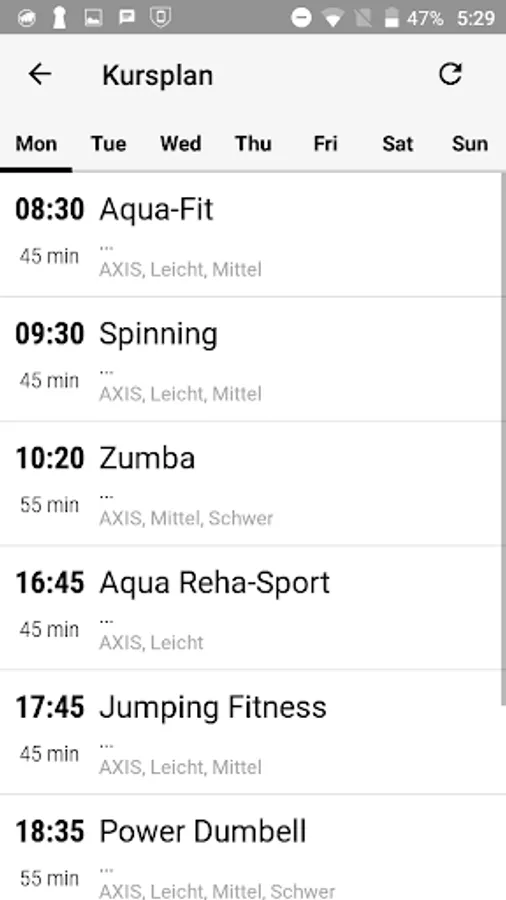 Direct and current access to the course plan of the Axis Balingen leisure center from anywhere: For each course you can view details such as time, course description, space and features such as See the difficulty.