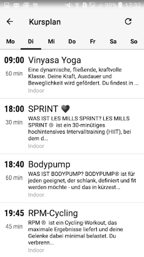 Direct and up-to-date access to the course plan from anywhere: For each course, you can add details such as time, course description, space and characteristics such as: B. see the level of difficulty. Whether a reservation is required for each course can also be found in the course schedule.