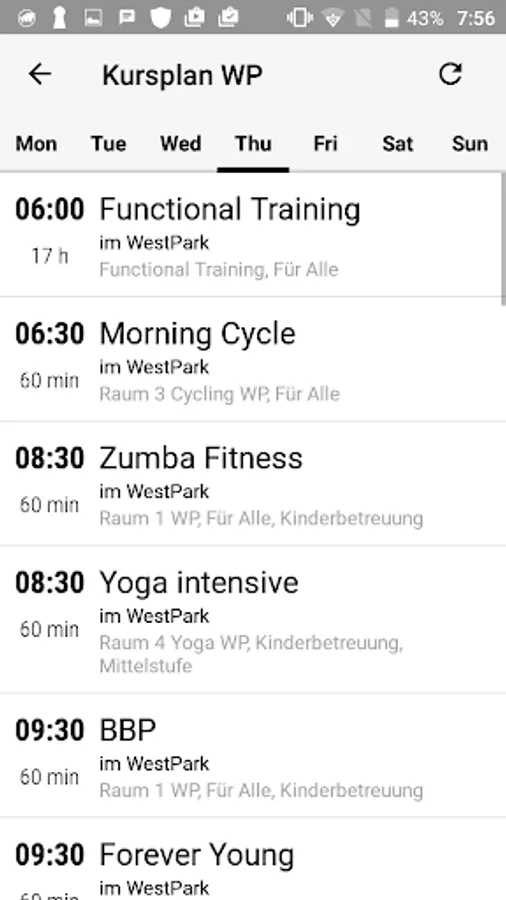 Direct and current access to the group training plan: For each course you can see details such as time, course description and senior coach.