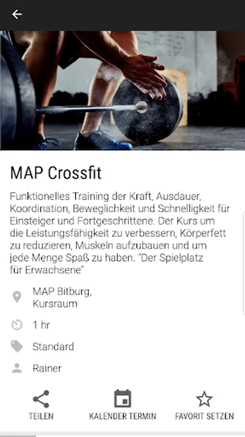 Direct and current access to the course plan of your MAP fitness clubs everywhere: For each course you can see details such as time, course description, space and features.