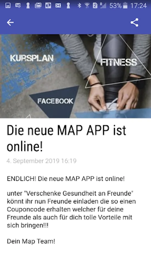 All news from the MAP SPORTS CLUB are always up to date on your iPhone and the key will be sent via notification on your smartphone so you know immediately when there are new courses and do not miss any more special events.