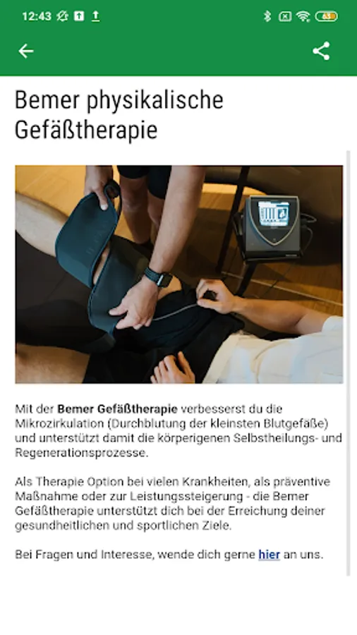 The most important things at a glance: Don't spend too much time looking for important information such as opening times and contact details. Thanks to the app, all you need to do is click on your smartphone to provide you with the information you need in no time. You can also browse the current studio photos in a relaxed manner - whether you are lying on the couch at home or have to wait at the train station. The possibility to arrange physiotherapy appointments simply by smartphone round off the possibilities. The highlight: You can share all reports with friends and acquaintances immediately by email.