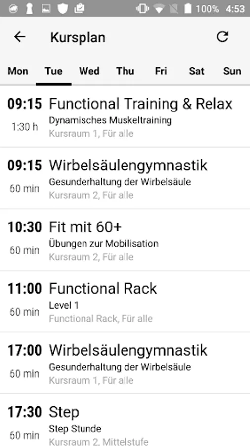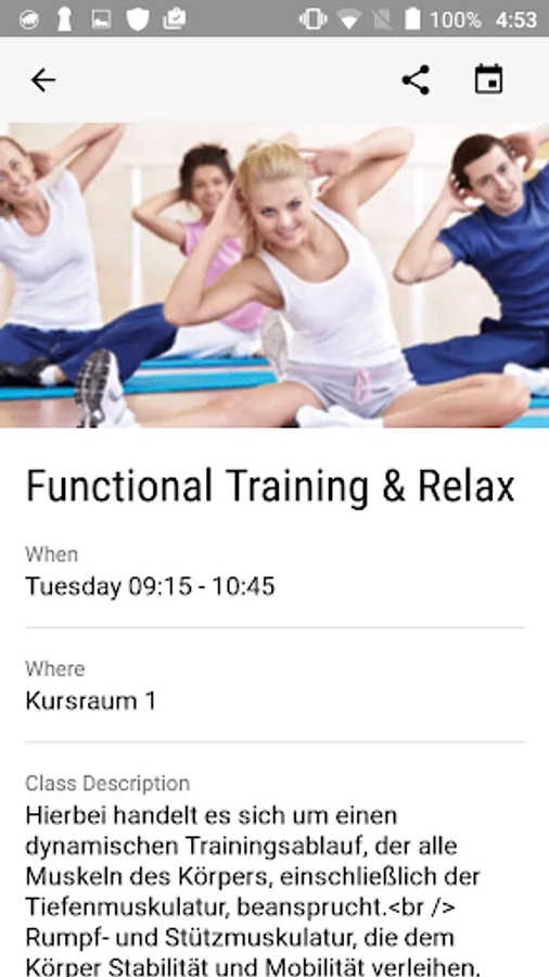Direct and current access to the group training plan: For each course you can see details such as location, time and course description.