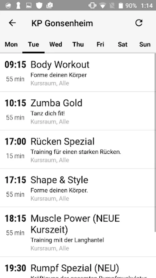 Direct and current access to the group training plan: For each course you can see details such as location, time and course description.