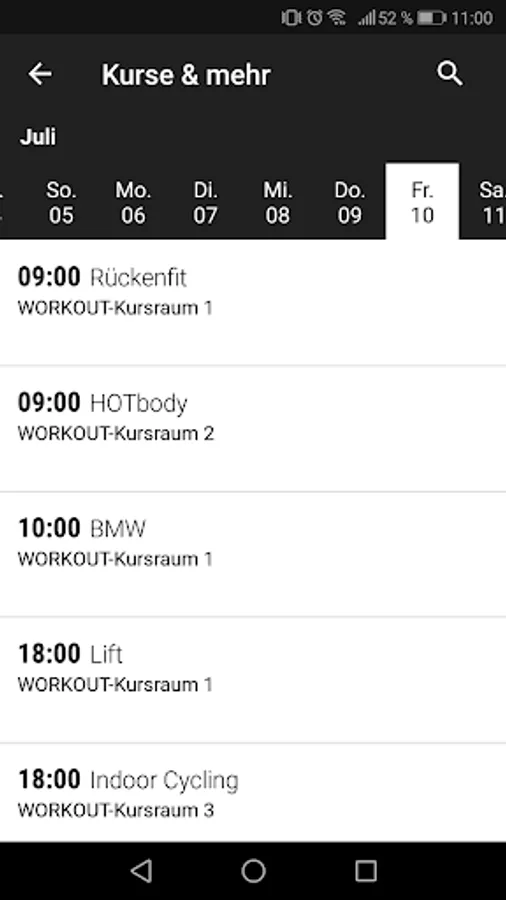You have direct access to the current course schedule including course description, time and course room, as well as the option to book online for one or more courses. Simply share your course participation on Facebook and motivate your friends directly via the WORKOUT app to attend a course together.
