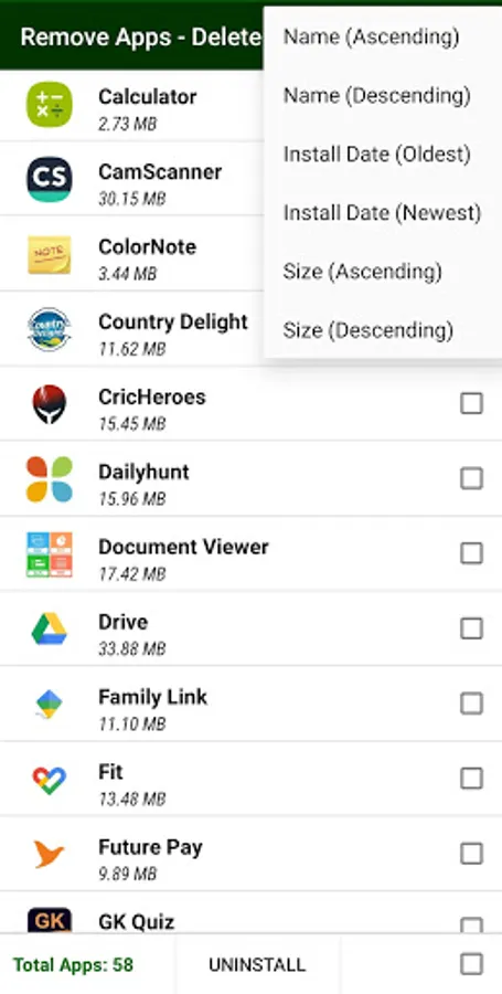 Remove Apps - Delete Apps - Uninstall also supports app search & sort. Type keyword in the textbox on the top to search the app that you want to uninstall. Click "Menu"->"Sort" to sort the apps in many sort types. You can share apps by clicking "Share".