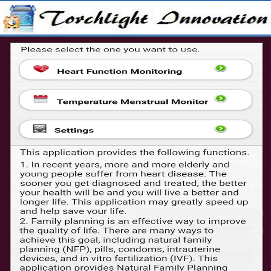 This application provides Natural Family Planning (NFP), which is the cheapest and harmless method. Use calendar method and basal body temperature method, the application is a symptom diagnosis tool. Specially monitor your daily body temperature, diagnose your abnormal condition. It can also predict your ovulation date, ovulation period and conception period.