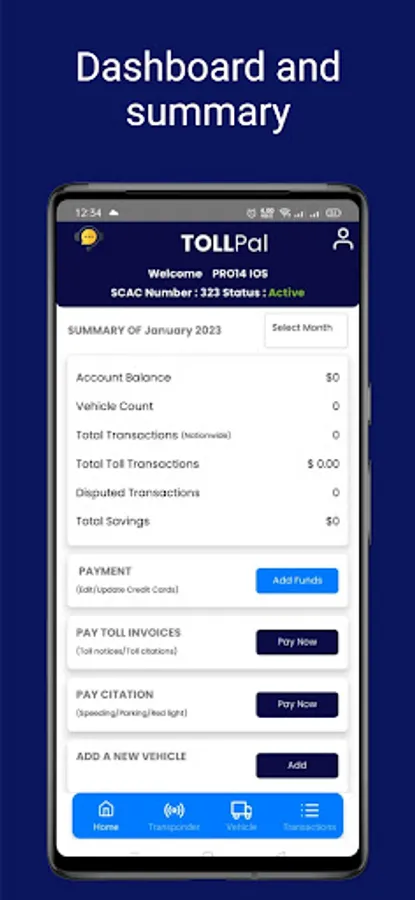 TOLLPal is a Fleet Toll Management App that allows owner-operators, carriers and fleets of all sizes to manage their toll activity nationwide from a single platform. TOLLPal allows for the users to sign-up online and get covered as well as stay compliant nationwide on all Toll roads, bridges and tunnels in the US. Users are able to add funds to their TOLLPal account which ensures that they are covered while driving on any Toll road, bridge or tunnel. Users are also able to manage their fleet and the assigned Toll Transponders accordingly on the app.