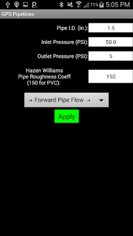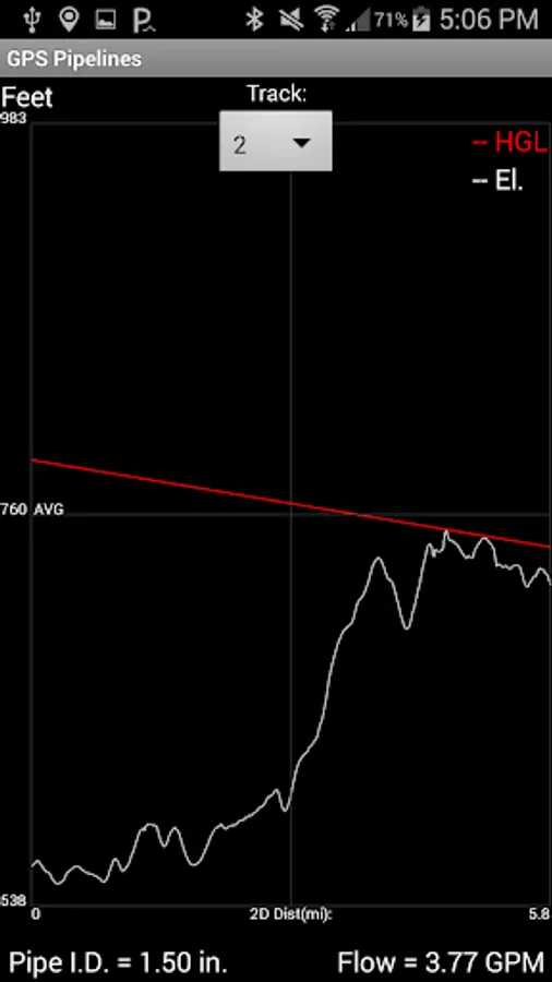 The water pipeline feature allows the user to assign a pipe diameter, Hazen-William’s Roughness Coefficient, flow direction, and inlet/outlet pressure to calculate a pipe’s maximum flow along tracks. The flow calculation is calculated continuously and assumes full pipe flow (Continuous acting air vents are typically installed at summits to release air and prevent debris from being pulled into pipeline leaks). The real time profile view, called water pipe chart, includes the hydraulic grade line so users can visualize the water pressure in the pipe and identify pipe summits that will reduce pipe flow.
