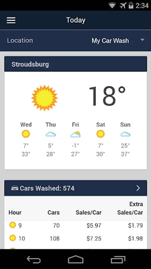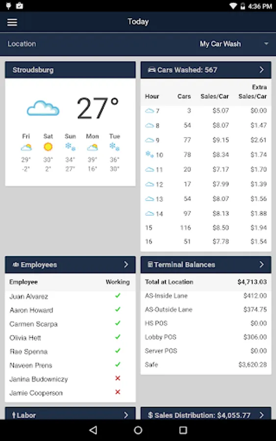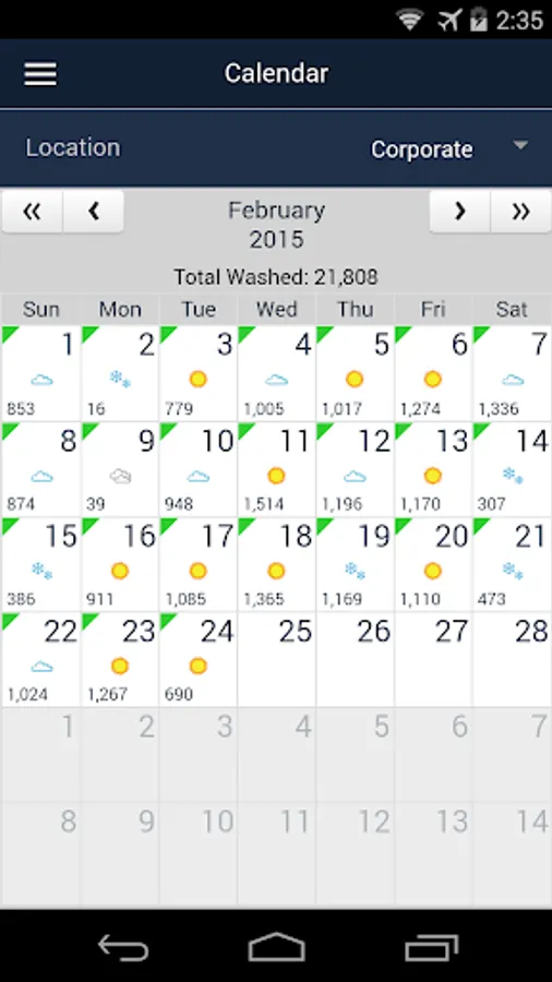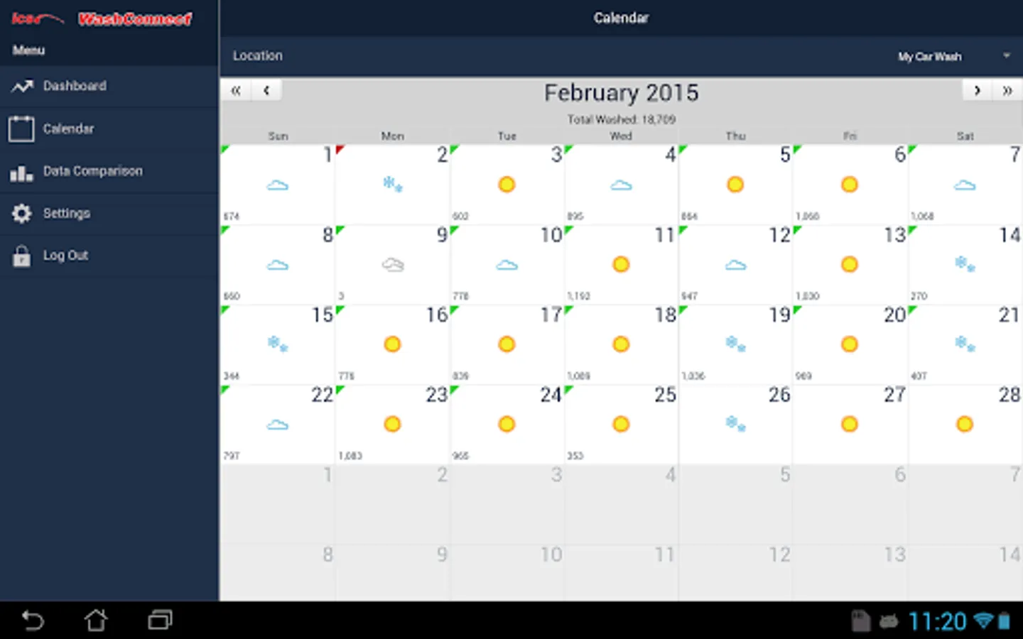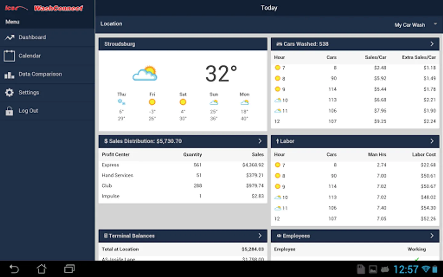 WashConnect® Mobile App is a management portal that offers ICS customers access to view financial reports. The reports that can be accessed include, Cars Washed, Employees Working, Employees Not Working, Terminal Balances, Labor Cost, Sales Distribution and Comparison Data for different date ranges, The Mobile App also gives weather information on each of the site with forecast for the next five days and an aggregate of cars washed for the month on a calendar.